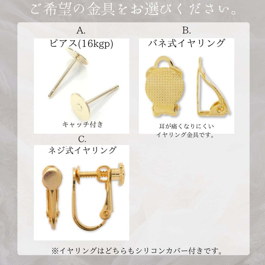 ※ピアス金具はサージカルステンレス(16kgp)コーティング、ソフトフィットイヤリング はニッケルフリーを使用しております。(アレルギー対応)